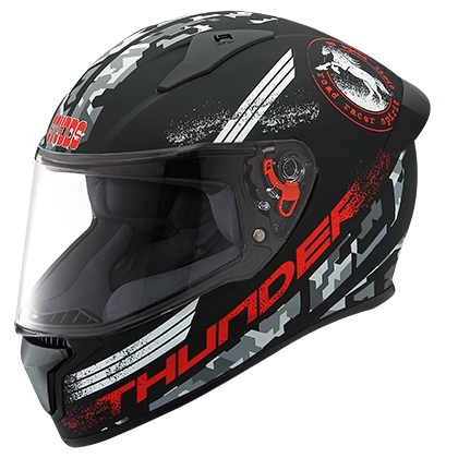 Thunder D1 Decor With Spoiler is a full-face helmet with quick release visor and product features like aerodynamic design with higher impact outer shell and UV resistant paint, regulated density EPS, dynamic ventilation system with air vent and air exhaust, hypoallergenic replaceable liner and quick release chin strap. Thunder D1 Decor With Spoiler is available in various sizes, graphics and decal options.